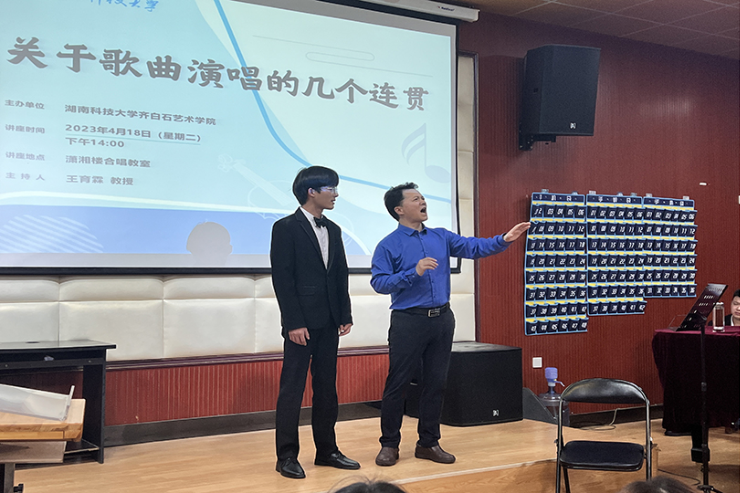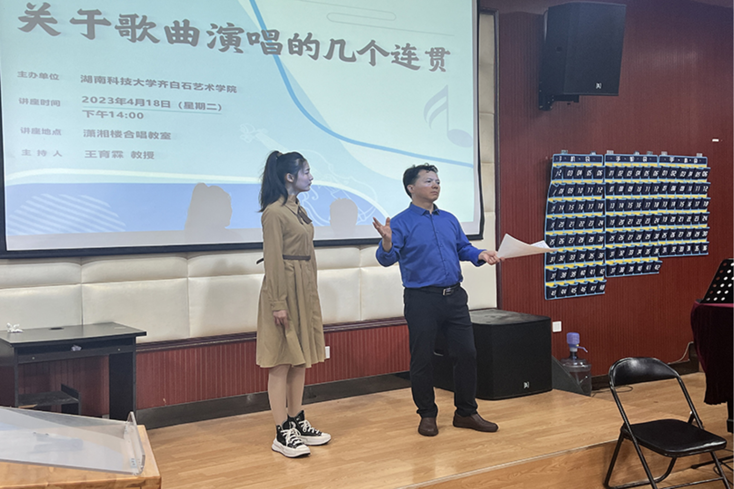 首先,王育霖对马关辉教授此次莅临指导教学表示热烈欢迎,并对马关辉教授的学术成就进行了详细的介绍。马关辉教授凭借多年的教学经验,深入浅出地阐述了对声乐表演的研究。为了更加形象具体地体现声乐技巧在学习过程中的灵活运用,马关辉教授对四位同学进行了现场声乐教学,在听完同学的演唱后,马关辉对其作品完成度表示肯定,同时指出了他们在歌唱中乐感、语言和乐句连贯等方面存在的问题,并现场进行一对一的指导示范。他提出歌唱时要讲究乐曲的张弛有度、腔正字圆,强调作为声乐生,除了要有扎实的歌唱基础,更要细品歌曲中的韵味,充分了解作品背景,演唱时要有情感起伏。通过观摩现场教学,让在场的师生们感受到我国少数民族民歌的魅力。