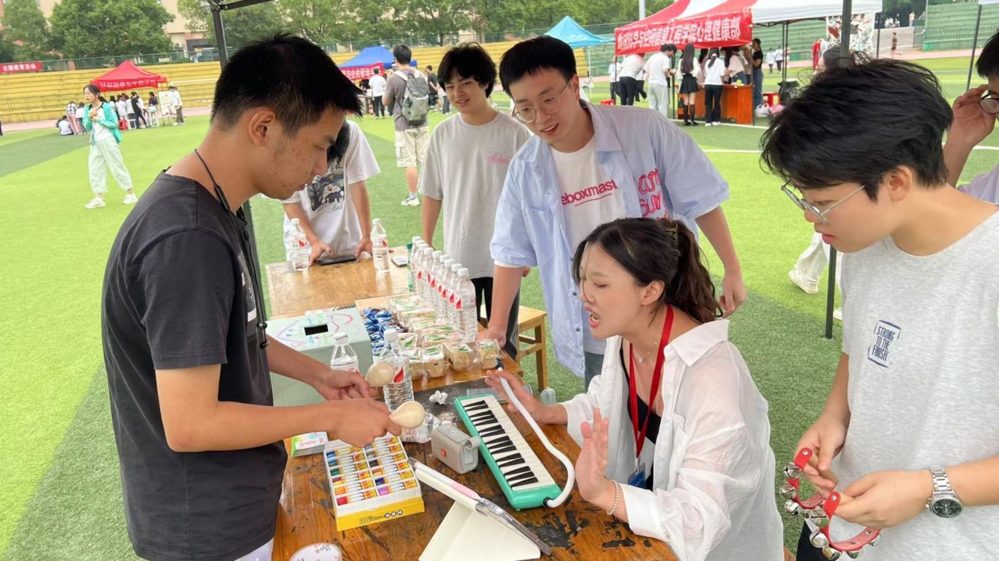 晚间,“动心缘起·愈心乐园”心理集市闪亮登场。现场以悠扬的电子琴演奏暖场,工作人员邀请同学们用铃鼓、木鱼等乐器即兴创作节奏。在轻松愉悦的氛围中,大家通过音乐互动释放压力,欢声笑语不断。