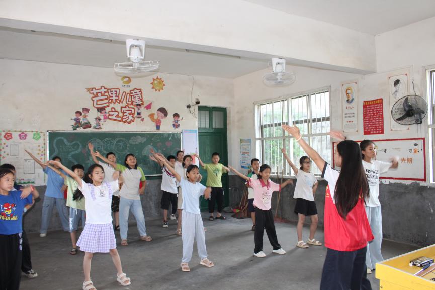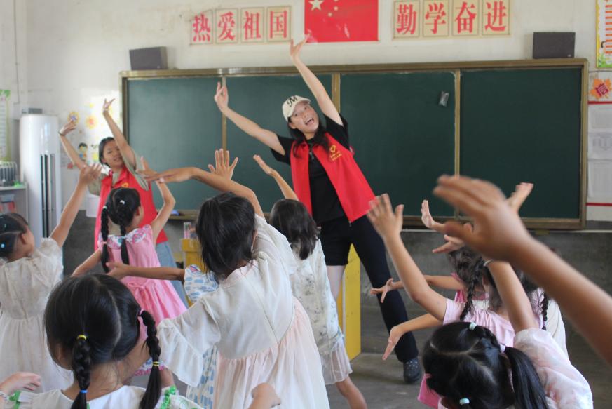 舞蹈课上,志愿者依年龄开展训练。低年级随《虫儿飞》旋律模仿蝴蝶振翅、小虫爬行,在律动中培养节奏感;高年级则练习《你要跳舞吗》,在活力的舞步中练习踢腿、转体等动作。孩子们会跟着志愿者的示范,认真模仿每一个动作。如果遇到孩子因动作不到位而着急,志愿者便耐心地再次讲解,“再试一次吧,你做得越来越好啦”。孩子们的动作已从刚开始的生涩渐至舒展熟练,他们不气馁、反复练习的模样,让志愿者倍感欣慰。