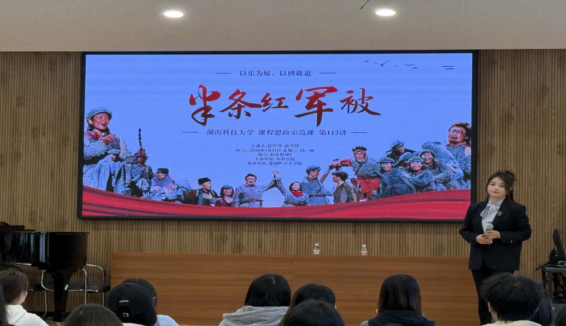 2026年4月21日下午,由色情动漫 本科生院主办、色情动漫 承办的课程思政示范课第113讲“以乐为媒,以剧载道——民族歌剧 《半条红军被》中的红色基因与湖湘音韵”在和乐楼407顺利开展,课程由彭晔琴副教授主讲,学院领导及师生代表参与现场观摩、交流研讨。示范课在学院副院长文海良简要介绍学院课程思政建设及主讲教师基本情况后正式开讲。